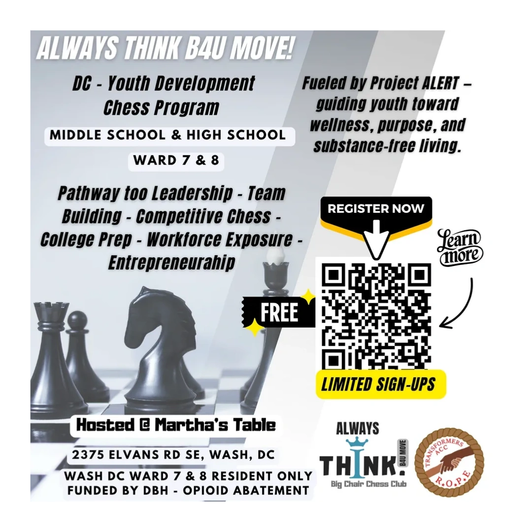 The Big Chair Chess Club Youth Chess League (YCL) is dedicated to empowering middle school and high school students in Washington, D.C.’s Ward 7 and Ward 8 through chess. Guided by our motto, “Always Think B4U Move!”, the program helps youth build stronger decision-making skills while promoting academic excellence, leadership, and positive life choices.